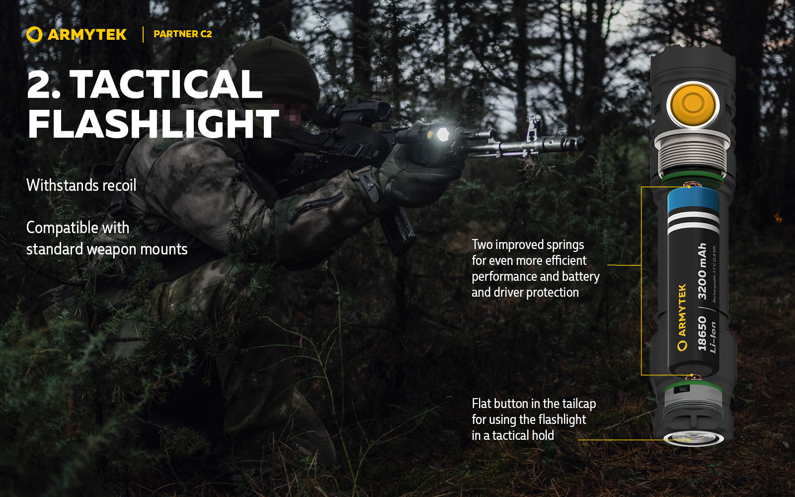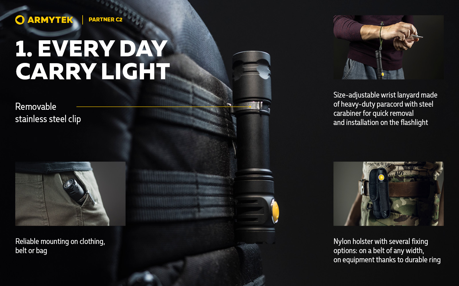 Every Day Carry light 2 в 1 с възможност за тактическо използване. Ясно централно светлинно петно, основен набор от режими, два бутона за работа и възможност за задна стойка — това е универсален фенер за къмпинг, ежедневно носене и специални задачи. Светлинна мощност 1100 лумена; Дължина на лъча 240 метра; 28 часа работа с едно зареждане на батерията; В комплекта има магнитно USB зарядно и батерия 18650 Li-Ion 3200 mAh.