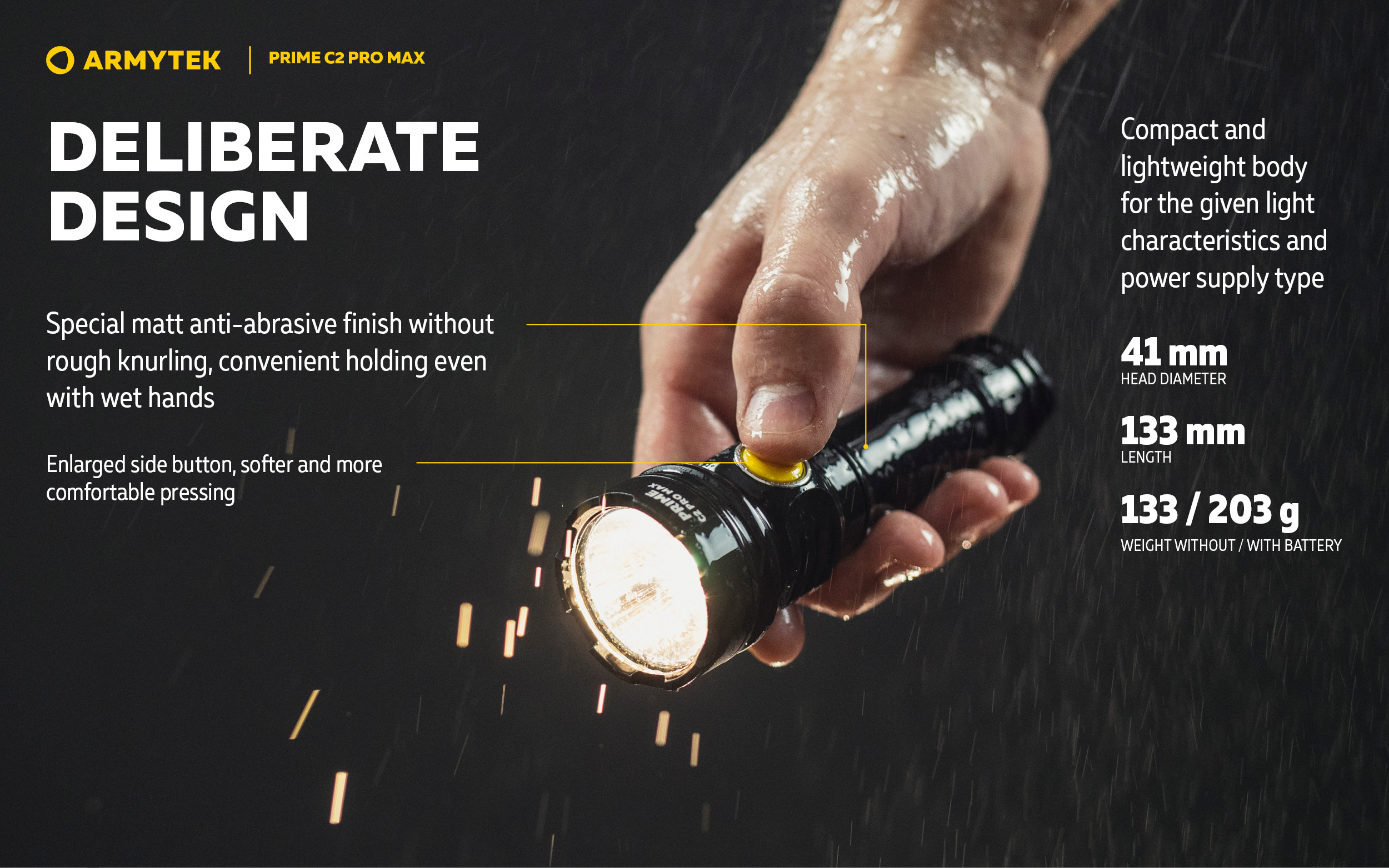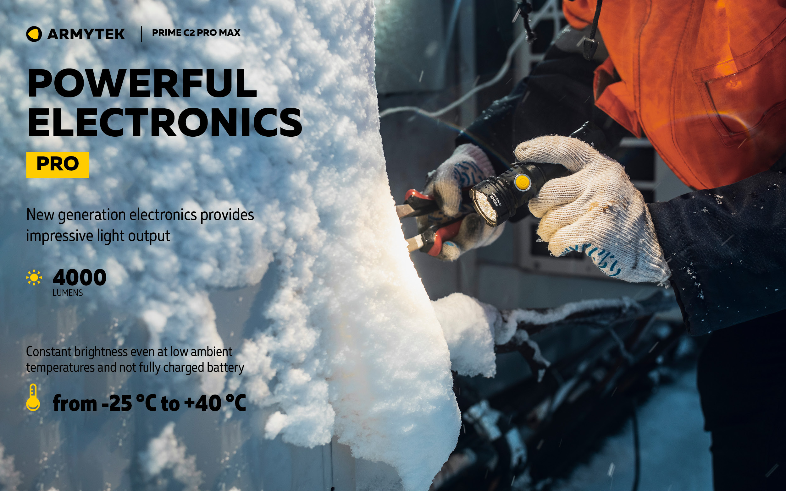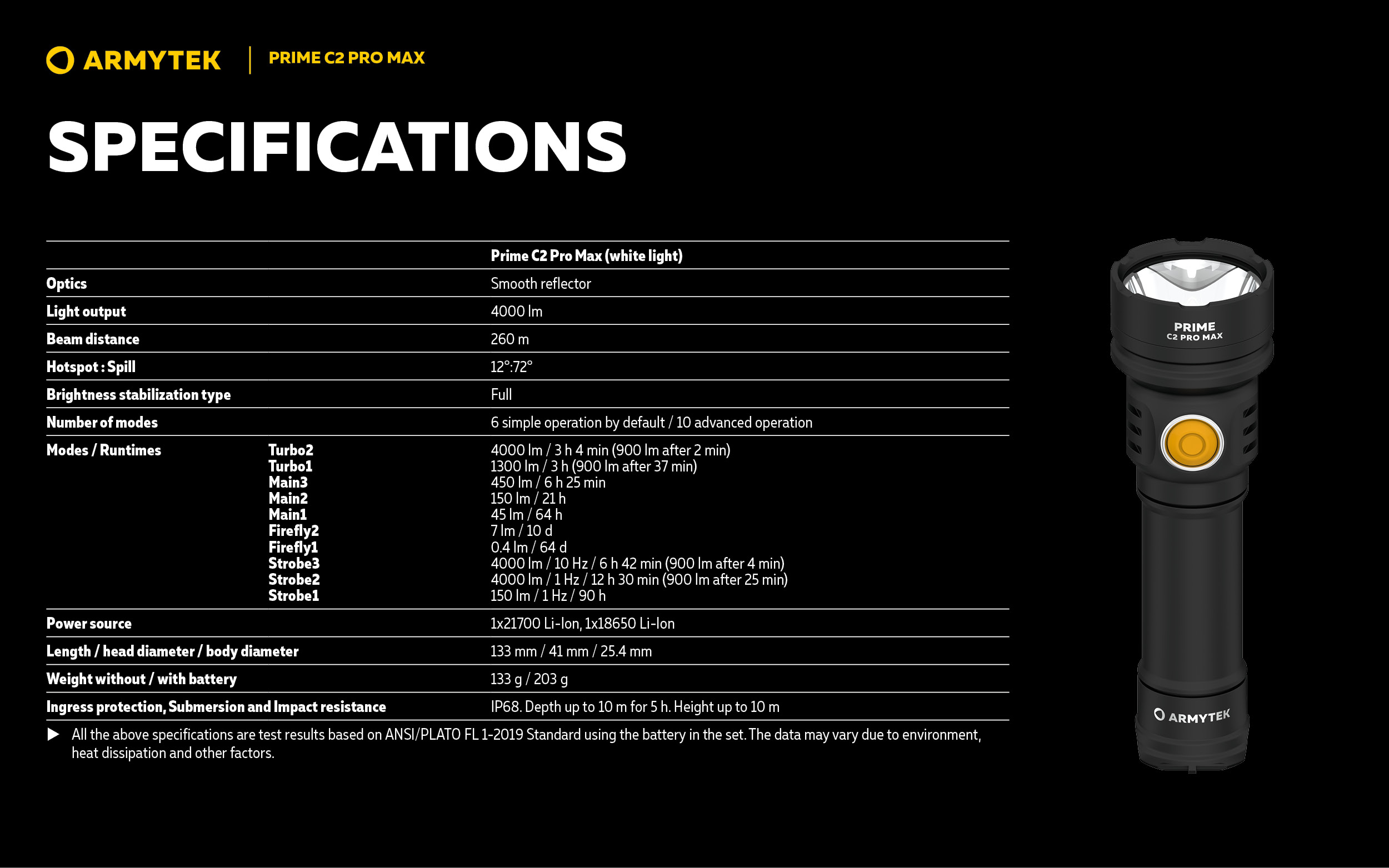 Водещ продукт от серията Prime — Every Day Carry светлина с голямо централно място, широко странично разливане и впечатляващо разстояние на лъча за такава яркост. Подходящ за ежедневна употреба, сервизна и промишлена дейност, както и за охранителна дейност. Светлинна мощност 4000 лумена; Дължина на лъча 260 метра; 2 месеца работа с едно зареждане на батерията; В комплекта има магнитно USB зарядно и 21700 Li-Ion 5000 mAh батерия.