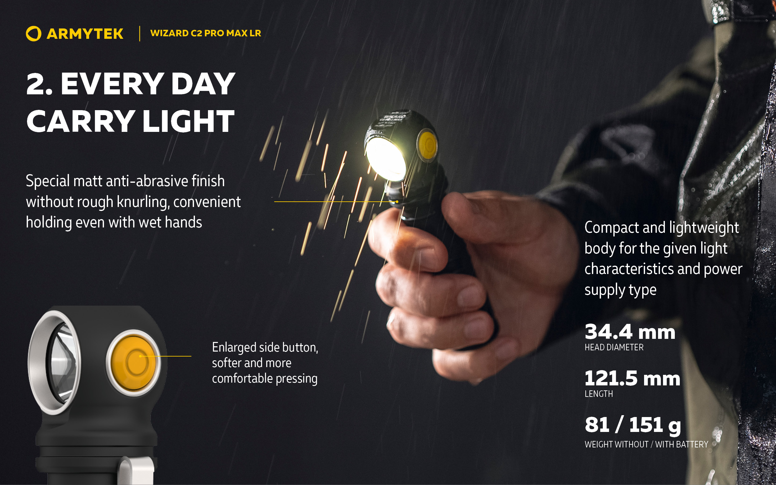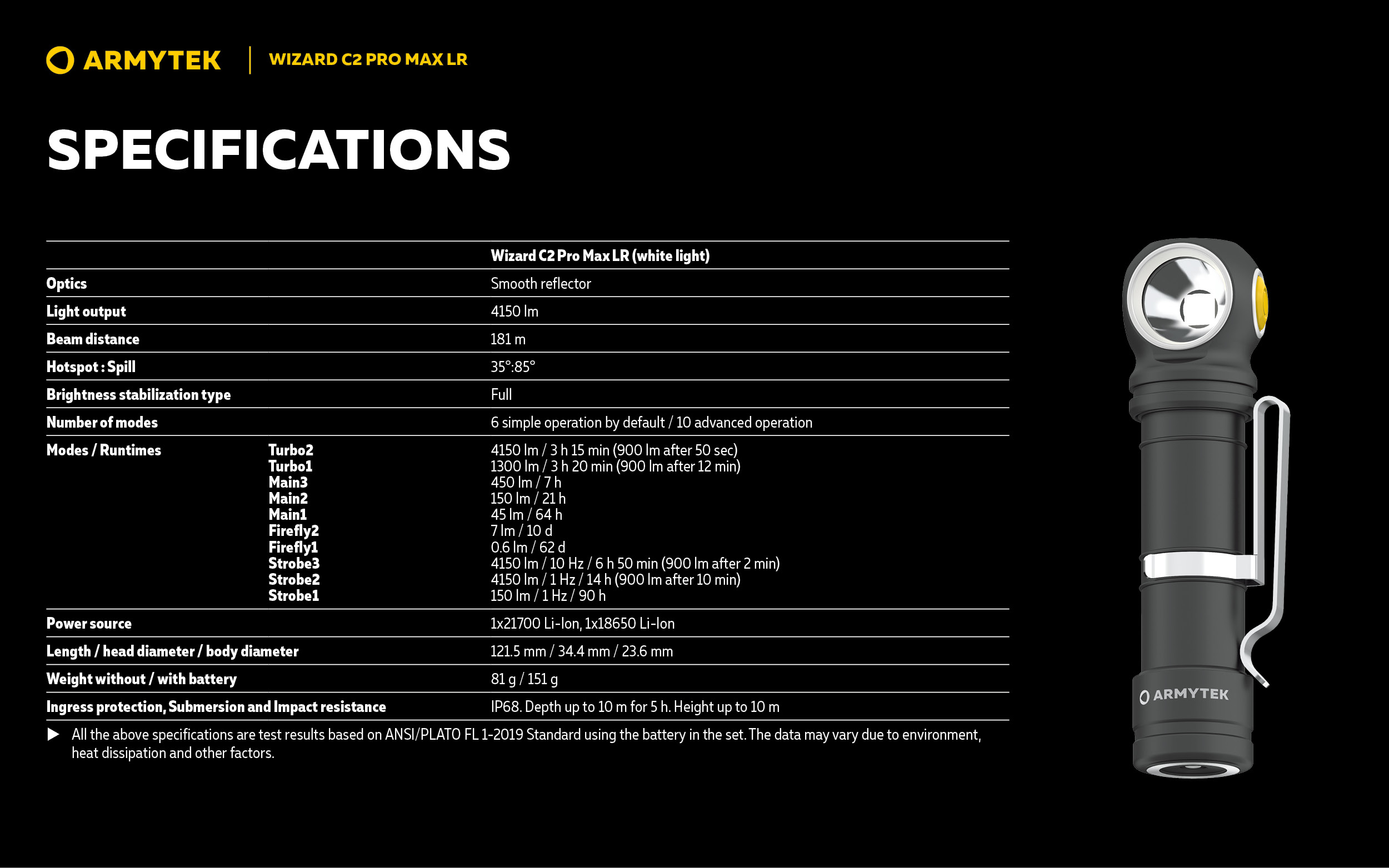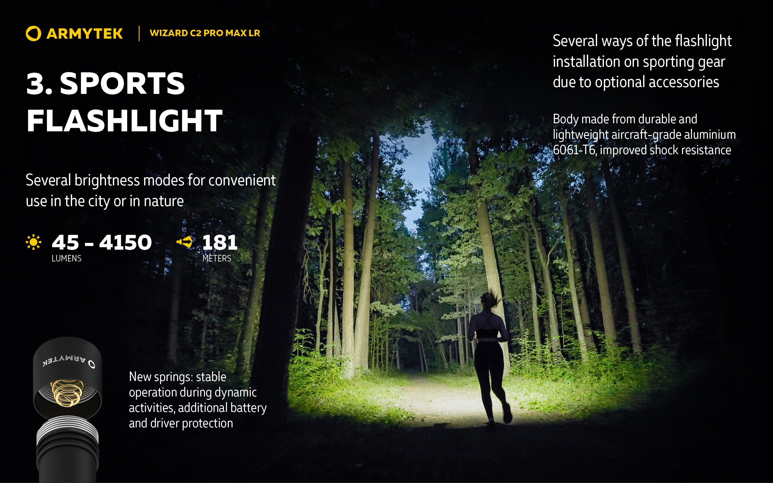 Светлинна мощност 4150 лумена; Дължина на лъча 181 метра; 2 месеца работа с едно зареждане на батерията; В комплекта има магнитно USB зарядно и 21700 Li-Ion 5000 mAh батерия.