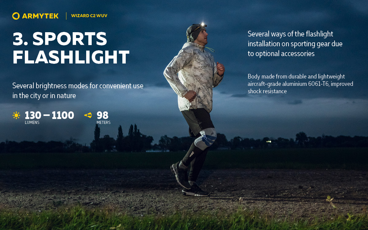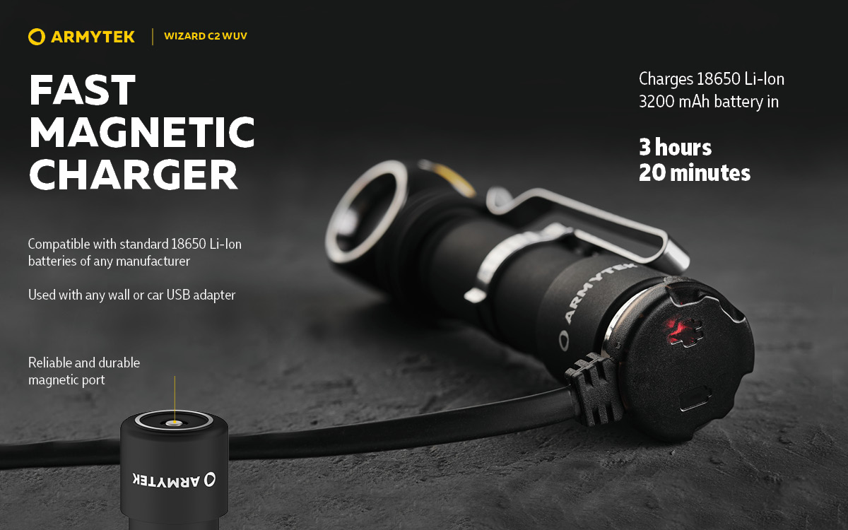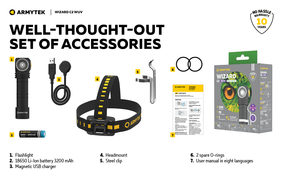 Светлинна мощност до 1100 лумена бяла светлина, до 1,6 W ултравиолетова светлина; Разстояние на лъча до 98 метра бяла светлина; Дължина на вълната 400 nm ултравиолетова светлина; До 2 месеца светлина с един източник на захранване; В комплекта има магнитно USB зарядно и батерия 18650 Li-Ion 3200 mAh.