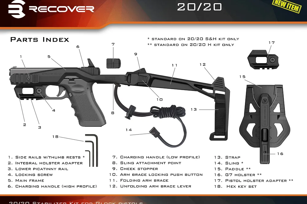 Комплект за стабилизация на стрелбата със сгъваем приклад Recover Tactical 2020N цвят Black или Tan е съвместим с тези модели пистолети Glock: